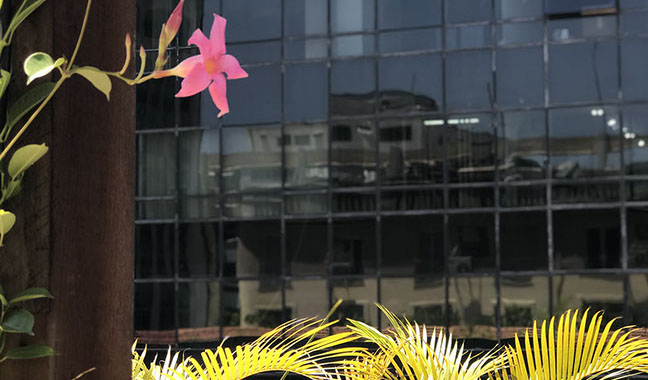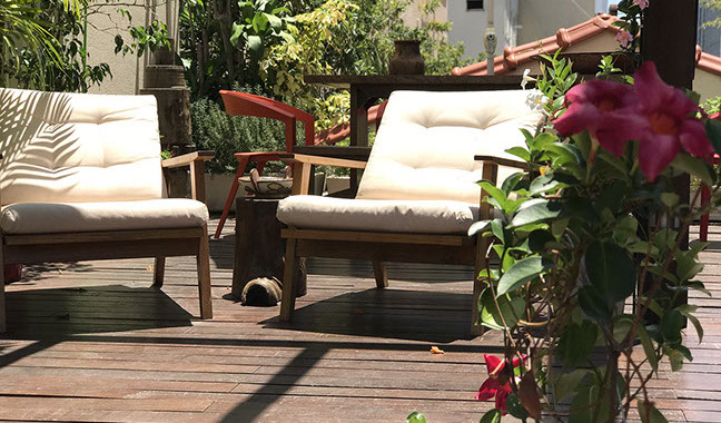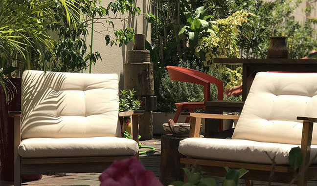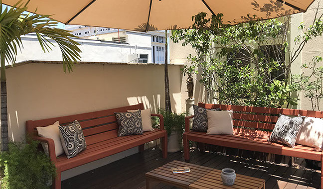 Esse espaço cercado de mais de uma centena de plantas, habitado por pássaros e confortavelmente mobiliado, principalmente com móveis de madeira bruta para uma melhor integração linear com os elementos da natureza, passou então a ser dividido com nossos clientes, parceiros do mundo jurídico e amigos em geral.